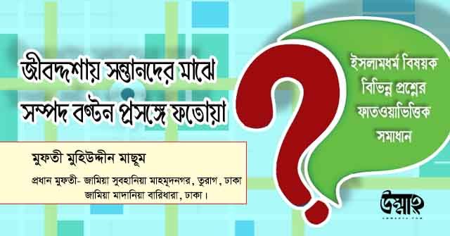 জবাবঃ (১) কোন ব্যক্তি নিজ জীবদ্দশায় পুত্র ও কন্যা সন্তানের মাঝে মাঝে স্বীয় সম্পদ বণ্টন করতে চাইলে পুত্র সন্তানকে সম্পদের দুই ভাগ এবং কন্যা সন্তানকে এক ভাগ, এ পদ্বতিতে বণ্টন করা জায়েয আছে।